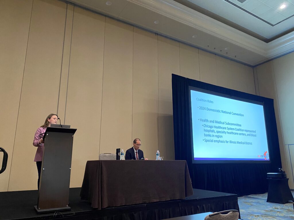 Representing Advocate Illinois Masonic Medical Center, Region 11’s Hospital Coordination Center, and CHSCPR, Ms. KC Booth and colleague Dr. Jason Liu (Medical College of Wisconsin) presented on Chicago and Milwaukee’s respective preparations and lessons learned from the United States’ Democratic and Republican National Conventions in 2024. Ms. Booth and Dr. Liu provided insight into the challenges faced by public and private health organizations before, during, and after these events, which are designated as National Special Security Events (NSSE) and among the most complex of mass gatherings. Multi-agency and partner collaboration (including through CHSCPR), care provision to a unique set of high-profile patients, and working with a complex national security footprint with heightened risks all while ensuring minimal disruptions to the surrounding community were just a few of the highlights covered during Ms. Booth and Dr. Liu’s presentation.